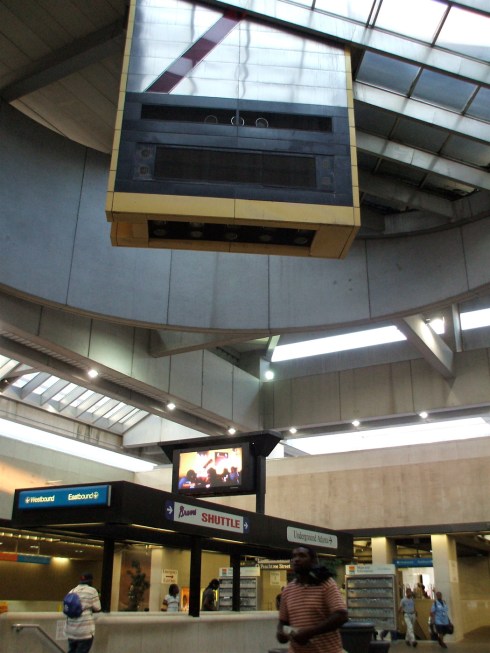 Afternoon commuters pass through the plaza at Five Points Station. The transportation tax would fund improvements like removing the non-functioning sign from the ceiling.
